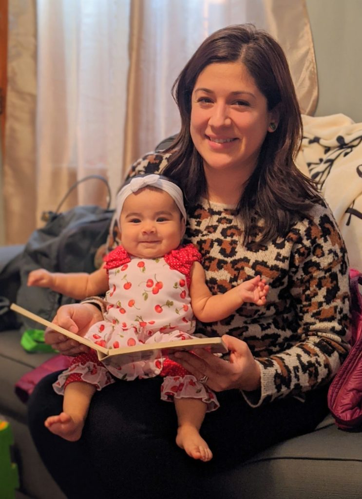 New Moms Family Support Specialist Noemy Céspedes holds six-month-old Valeria on Dec. 2, 2019. Noemy meets with young moms for in-home coaching visits twice a week in addition to leading the support group based out of Morton East High School.